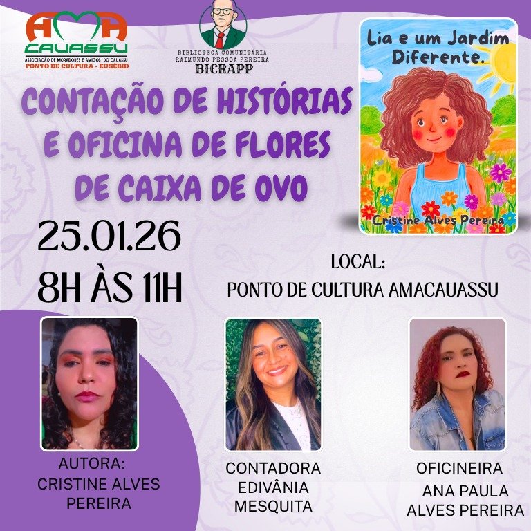 A atividade contará com a contação da história “Lia e um Jardim Diferente”, conduzida pela contadora Edivânia Mesquita, e uma oficina de flores com caixa de ovo, mediada pela oficineira Ana Paula Alves Pereira, estimulando a consciência ambiental, a criatividade e o reaproveitamento de materiais.